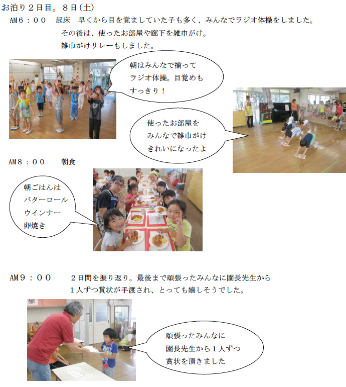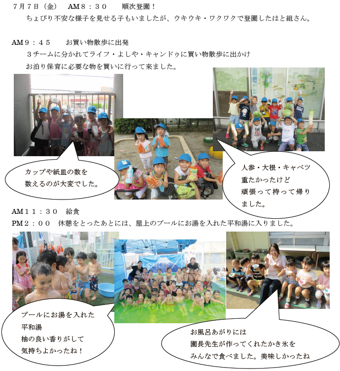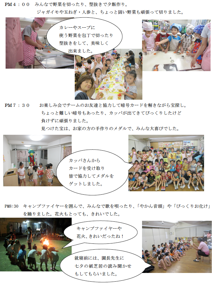 7月7日(金)8日(土)の2日間に渡って、年長さん(はと組)がお泊り保育に参加しました。その様子をお伝えします。