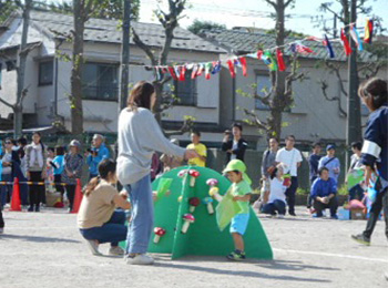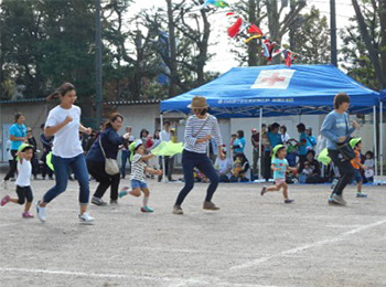 いつもは保育者やお友達とやっているしっぽ取り、運動会ではお母さんやお父さんのしっぽを取るために緊張しながらも一生懸命追いかけました。