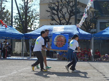 2年越で実施できた地域競技園長先生の写真付の段ボール箱を4人で運びます。
