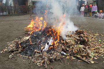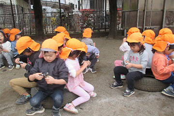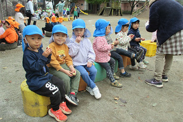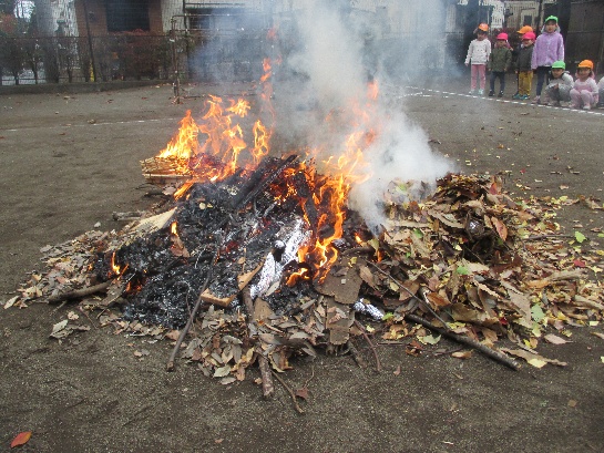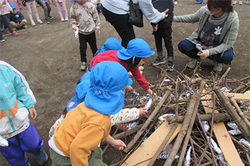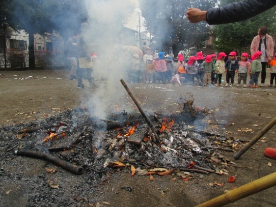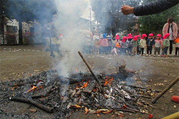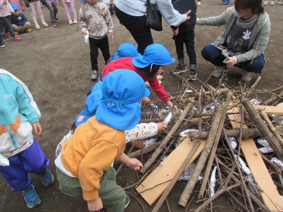幼児さんが新聞紙とホイルで包んでくれたさつま芋を、一つずつ薪の間にそっと入れていきます。普段の暮らしの中で火を見る機会の少ない子どもたちです。炎の燃え上がる勢いや煙の臭い、目に沁みる感じ、さつま芋の焼けたいい匂いなど五感を使って、秋を感じ取ってくれたことと思います。