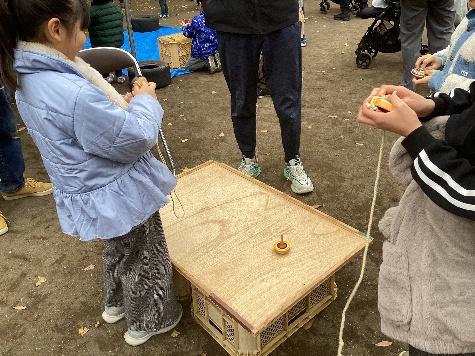 【昔あそびコーナー・こま回し・折り紙・輪投げ】
