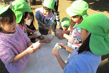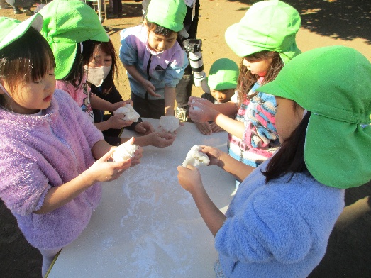 こうしてみんなでついたお餅を、最後5歳児クラスの子ども達に鏡餅の形にしてもらいました。「ベトベトする」「固くなっちゃった」等、悪戦苦闘していましたが、なんとか形を作っていました。