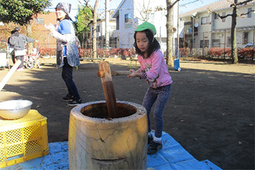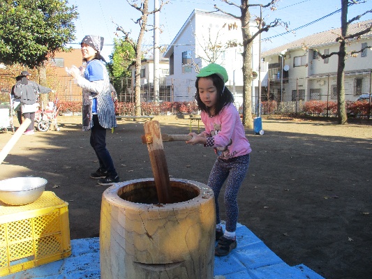 餅つきが始まると、臼と杵といったと普段はなかなか見られない道具に、子ども達も興味津々な様子でした。3・4・5歳クラスの子ども達は「早くやりたい!」と自分の餅つきの順番を待ちきれない様子でした。いざ自分の番になると「よいしょ!」の掛け声に合わせて、力強くお餅をついていましたよ。