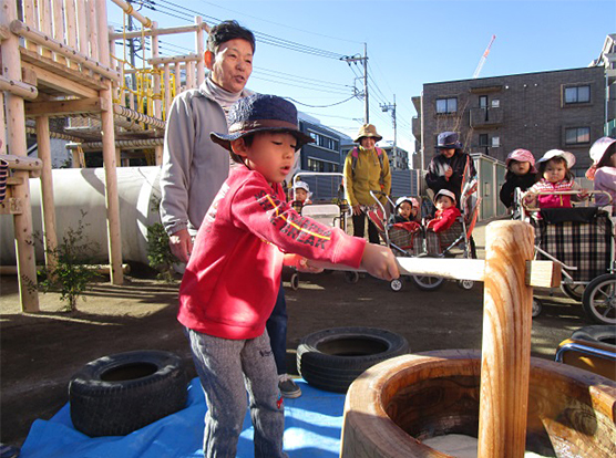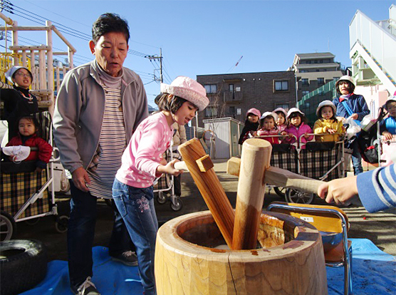 新園舎での初めての開催となりましたがお天気にも恵まれ晴天の中行うことができました。おもちつきの様子が伝わるよう当日のクラスについて載せていきます!