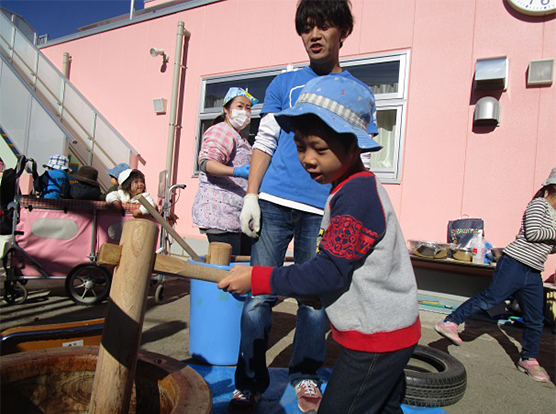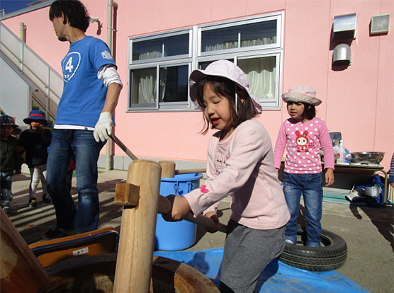 子ども達がもちをつくたびに「よいしょー」と大きな掛け声が飛び交い、おもちつきが盛り上がりましたよ!!