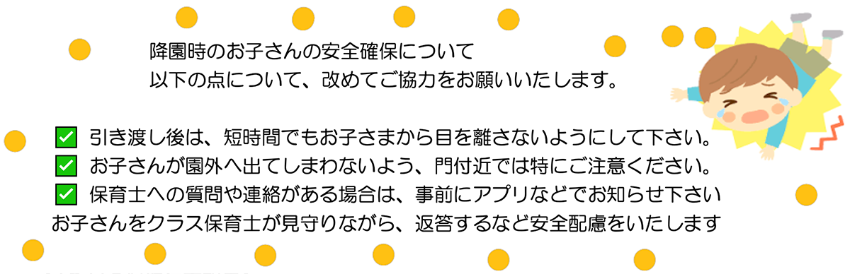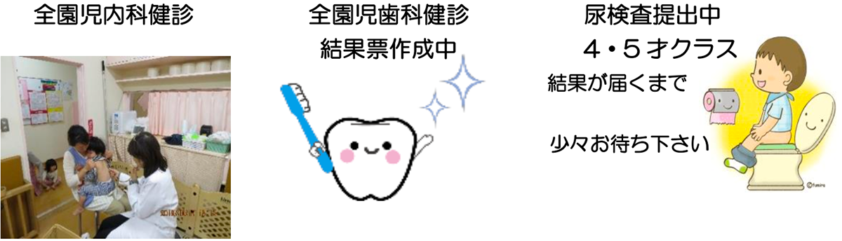 体位測定:4日(火) 0・1才 5日(水) 2・3才 6日(木) 4・5才 0才児健診13日(木)