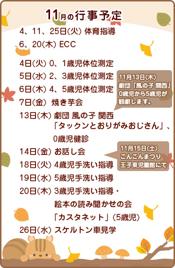 さて、11月は楽しみな行事が続きます。先日4、5歳児クラスが掘ってきたさつまいもを使って、焼き芋会を計画中。また、劇団「風の子」を招いての観劇会もあります。
