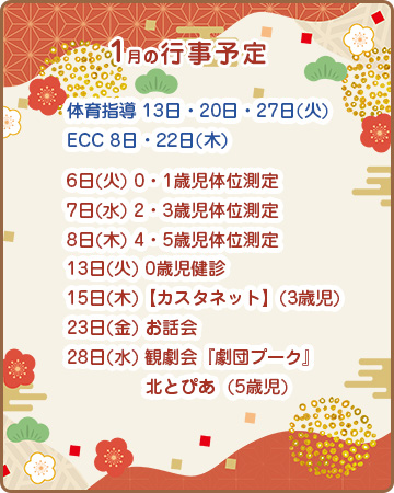 今月は、かるたやすごろくなどのお正月遊びを通して、日本の伝統文化に親しむ機会を大切にしています。少し先になりますが2月4日には節分(立春)に合わせて、園に獅子舞を招待しました。「獅子舞に頭を噛んでもらうと、その一年を元気に過ごせる」といわれています。怖がってしまう子もいるかと思いますが、伝統的な「本物」に触れるドキドキ感や、終わった後の「頑張った!」などの達成感を大切に、子どもたちの心の成長に繋げていければ幸いです。