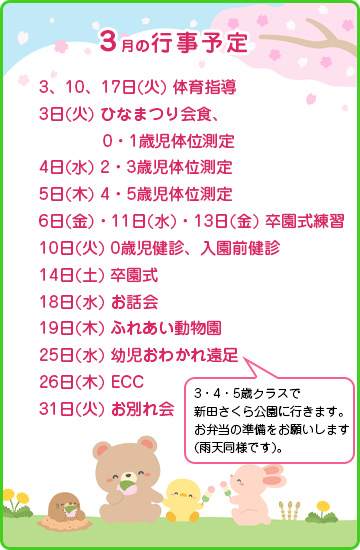 園庭のあんずの木がほころび始め、玄関のめだかたちも元気に泳ぎ回まわる姿に、春の足音を感じる季節となりました。