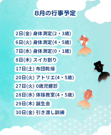 また、8月30日は年1回の引き取り訓練を行います。大震災から100年以上経ち、いつ震災が起こるかと言われています。この日は震災後の過ごし方等子ども達が体験する日となっています。ご家庭でも万が一の時の為に、家庭での防災の取り組みを話せると良いですね。ご協力をお願い致します。