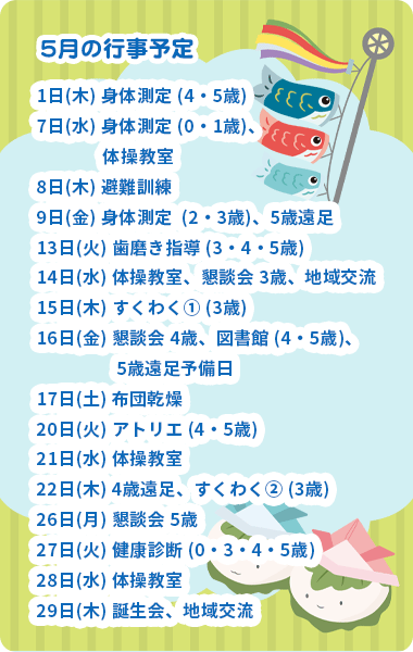 新しいクラスにも慣れ、子ども達は個々に個性を発揮してきています。天気の良い日は、園庭や散歩などで沢山身体を動かしていきたいと持っています。また、暑くなる日も増えてくると思いますので、衣服の調節はこまめにしていきたいですね。