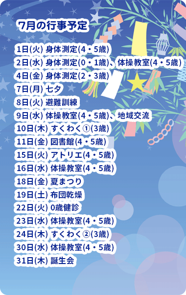 保育園では、今年も短冊にお願い事を飾ります。短冊が配布されたらお家でお願い事を書いていただき、各クラスの前に一人ずつに切り分けた笹がありますので、お子様と一緒に短冊の飾り付けをお願いします。飾り付けの期間は7/1(火)~7/7(月)の朝までです。