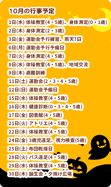様々な秋の行事を通して、子ども達の心と身体に沢山の栄養と経験が刻まれますよう、職員一同サポートさせて頂きたいと思っております。お子様の体調の管理を宜しくお願い致します。