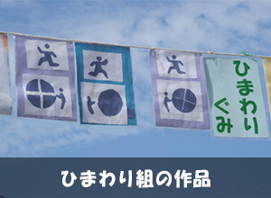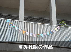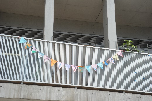 運動会の前には万国旗やクラス旗をつくっています。万国旗といっても国旗だけではなくオリンピック競技のピクトグラムやクラスのキャラクターのイラストなど、作品は様々。競技には参加できなかったすみれ組さんも万国旗をつくって飾ってくれました。