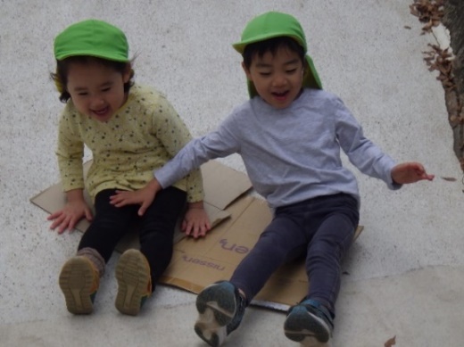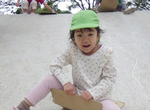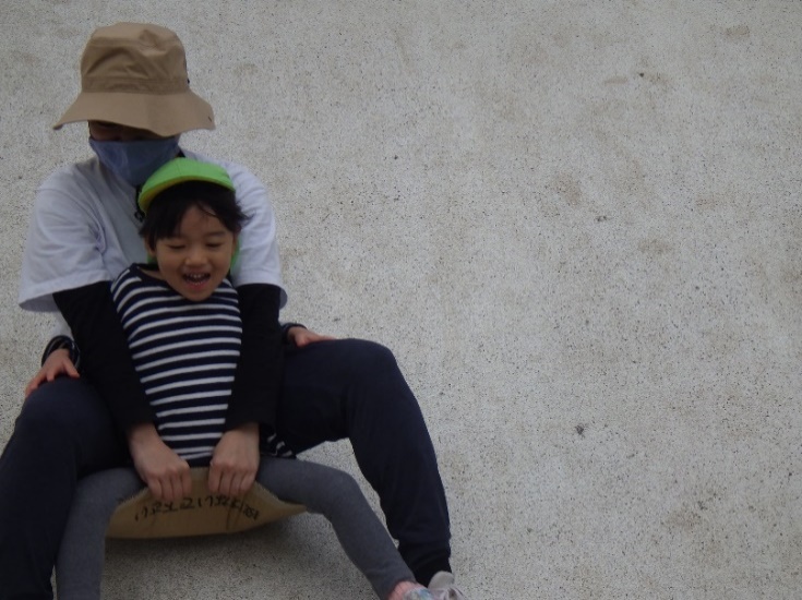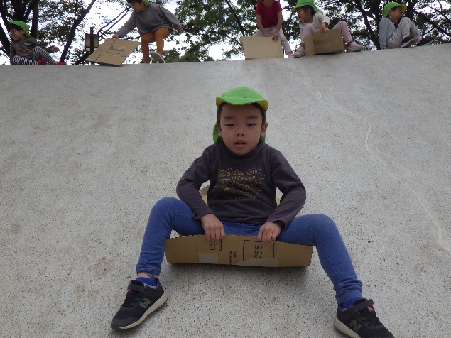 早く歩けばたくさん遊べる!と行きは30分で到着。公園での一番人気は大きな白いすべり台でした。段ボールをたくさん持って行ったので、そりのようにシューッと何度も滑っていましたよ。シンボル遊具の汽車は、アニメ「鬼滅の刃」の無限列車編ごっこにぴったりだったようで、ごっこ遊びが白熱していました。地域の小さなお友だちと遊んだり、のんびりとブランコに乗ってみたりと、各々満喫していました。ラムネを食べて元気をつけた後、お弁当を励みに帰ってきました。