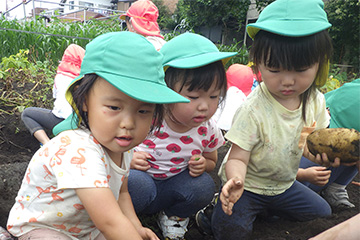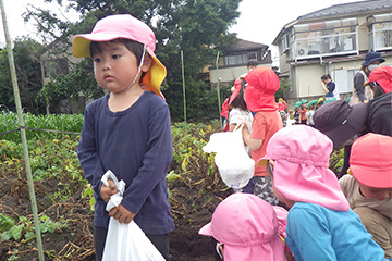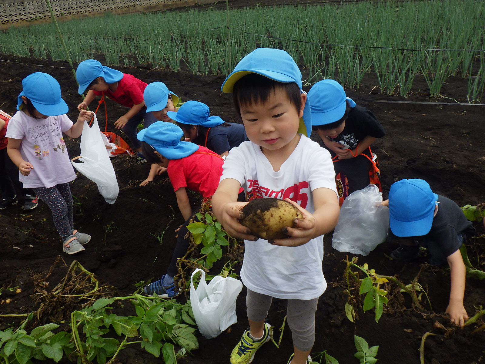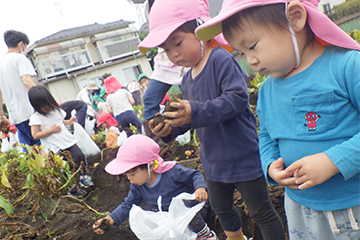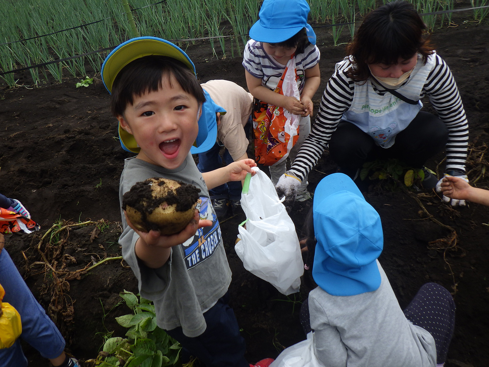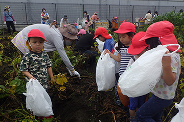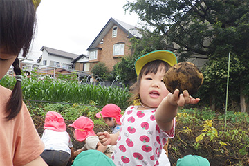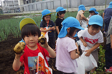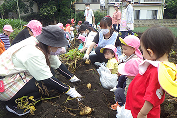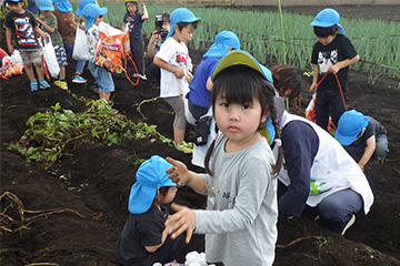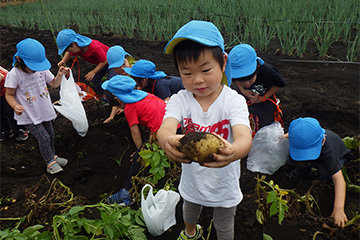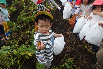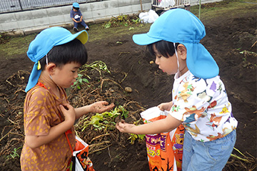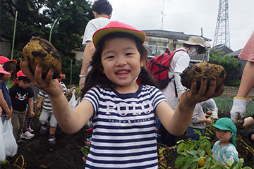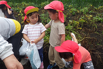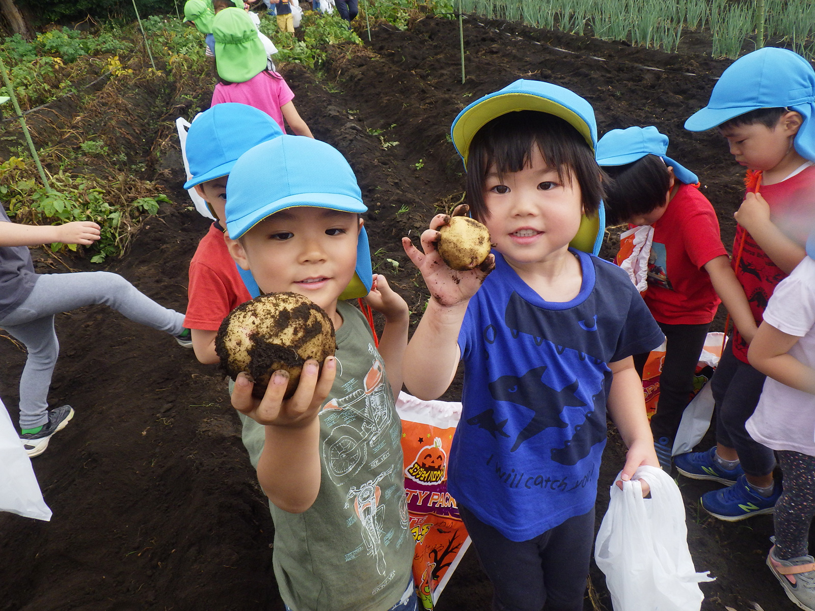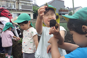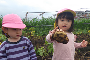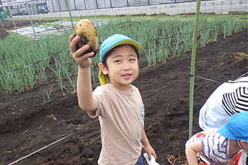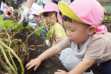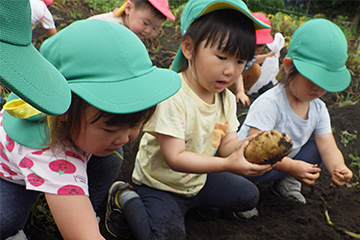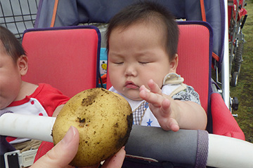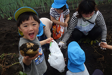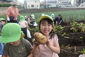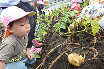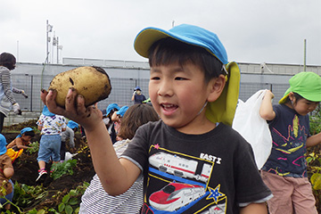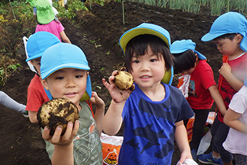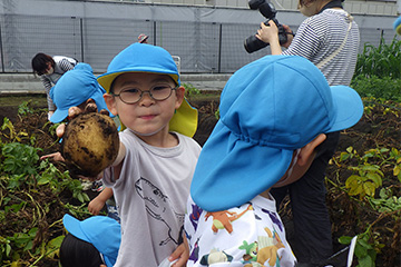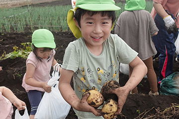 今年も豊作で、大きなじゃがいもを手にして子どもたちは目を輝かせていました。畑の土に触れ、手や顔を真っ黒にさせながら夢中になっている姿が印象的でした。