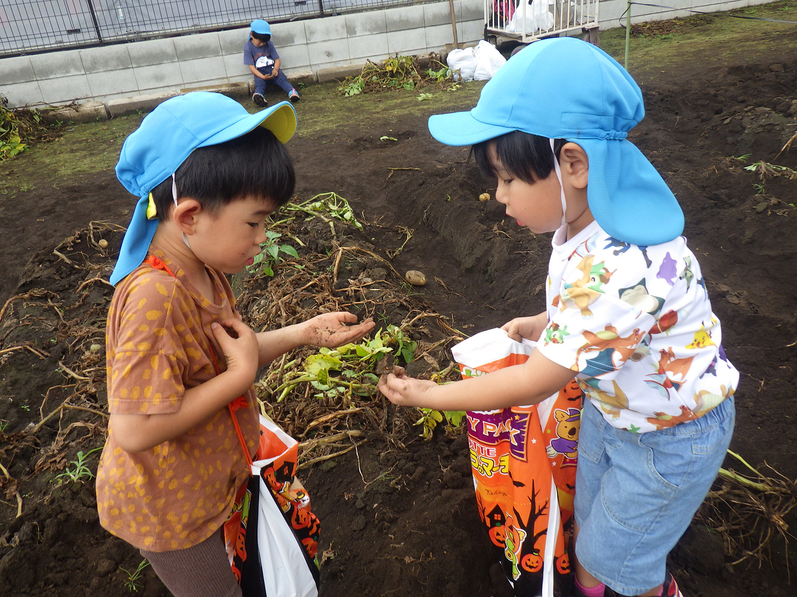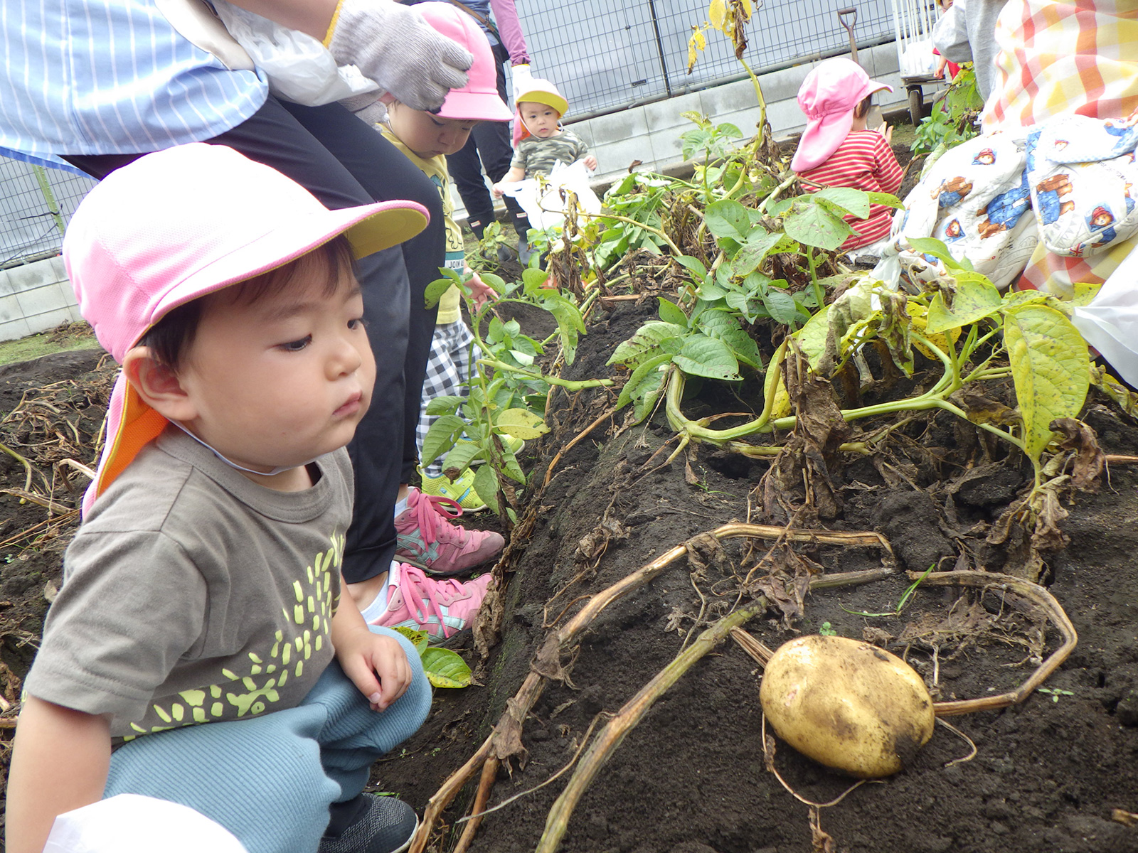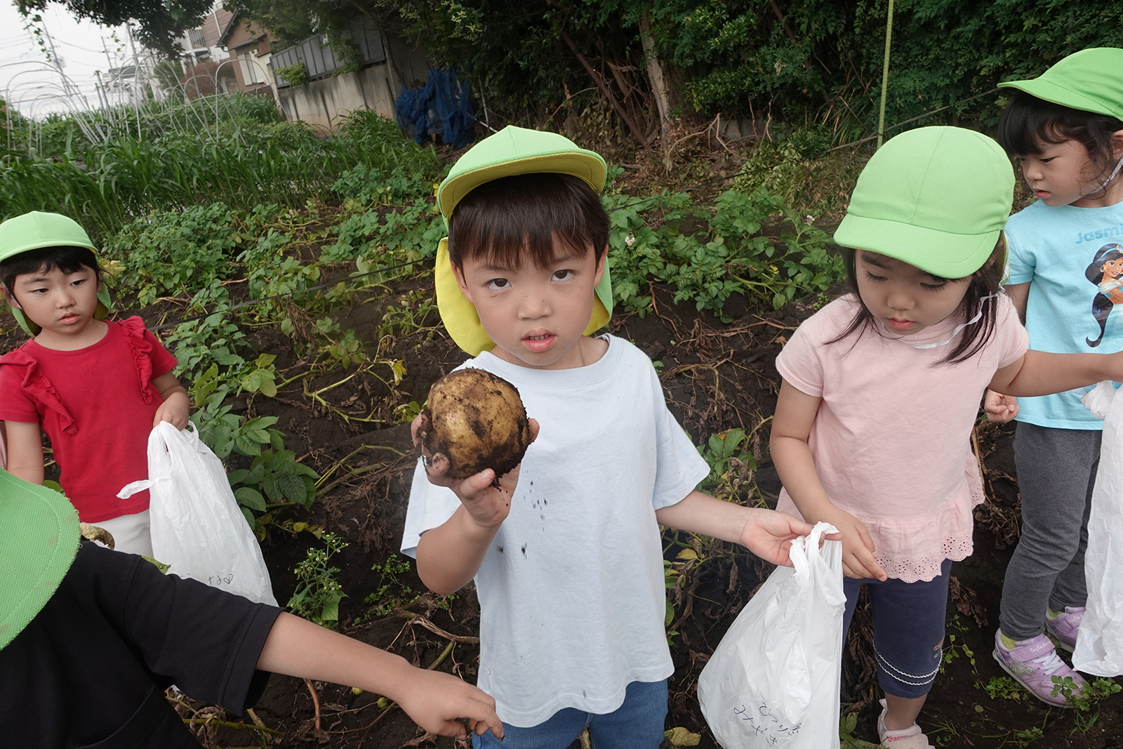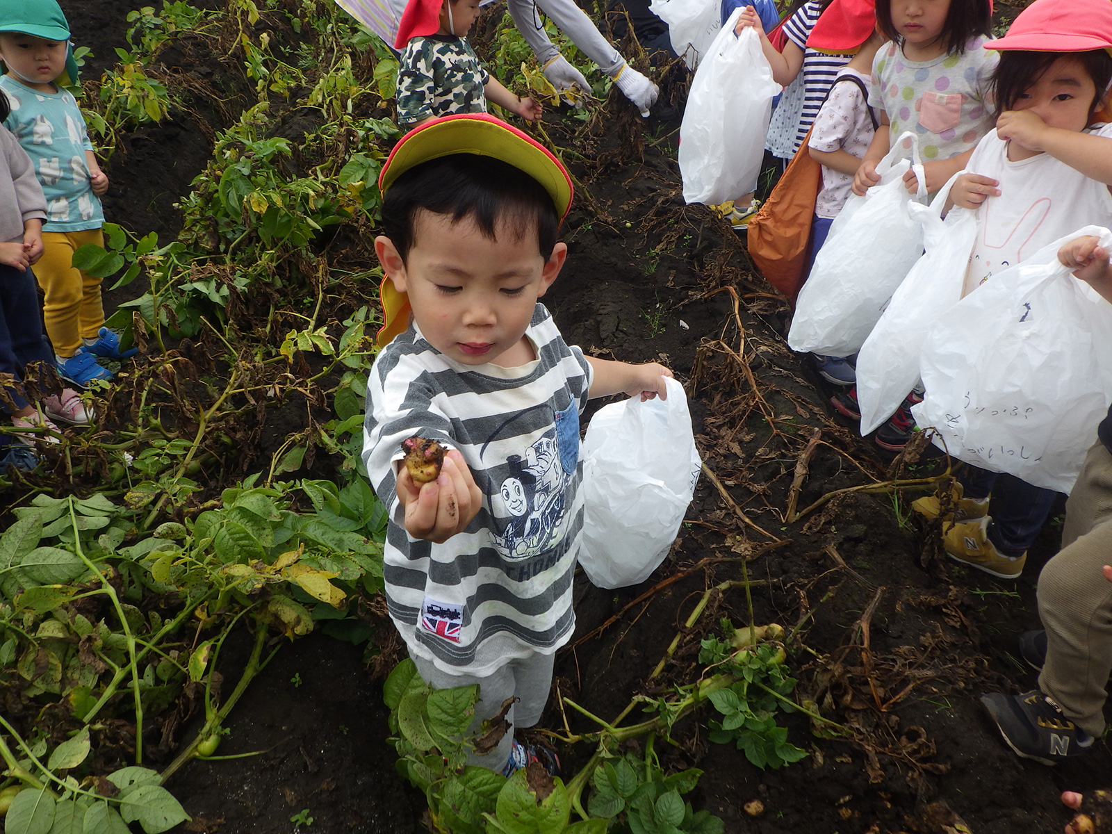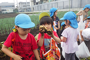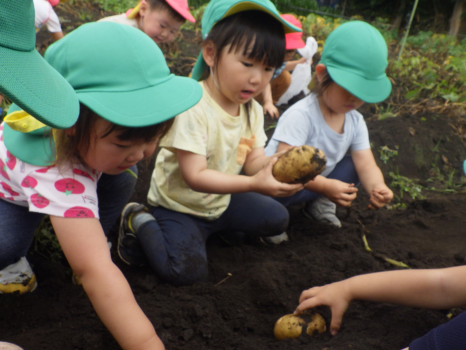 今年も豊作で、大きなじゃがいもを手にして子どもたちは目を輝かせていました。畑の土に触れ、手や顔を真っ黒にさせながら夢中になっている姿が印象的でした。