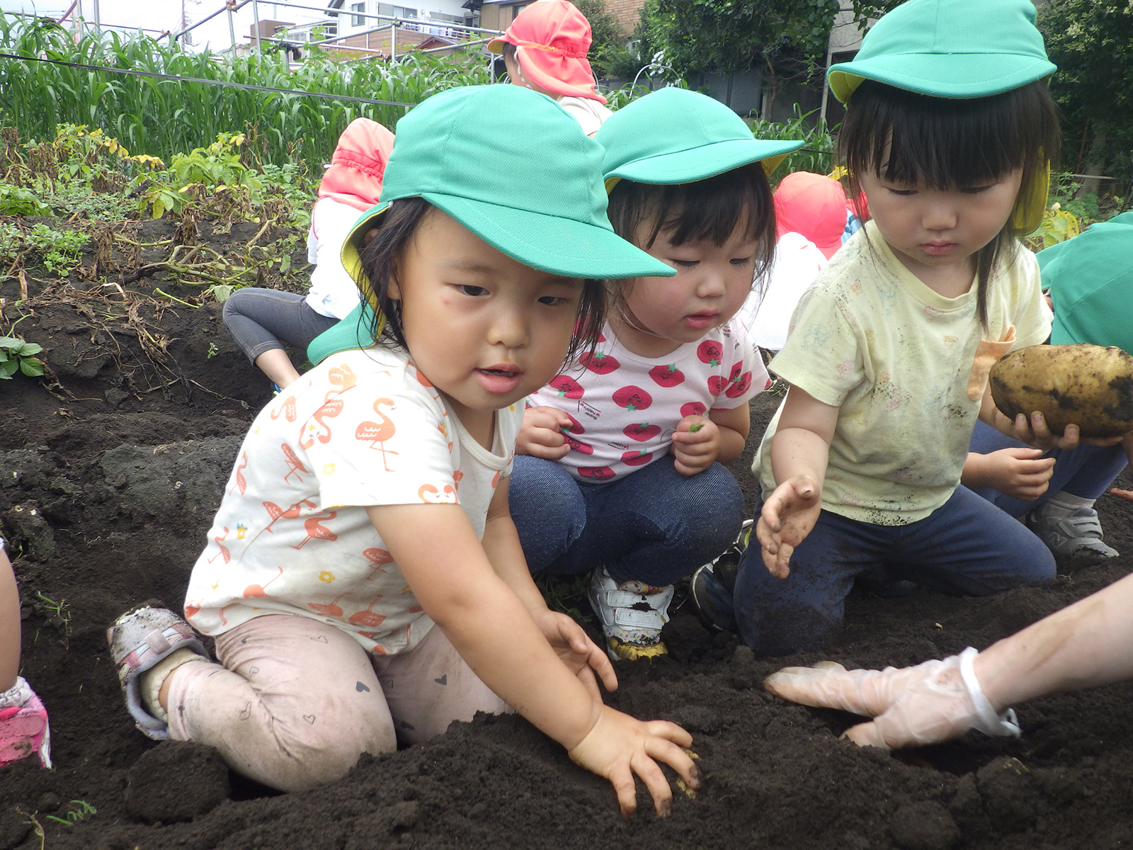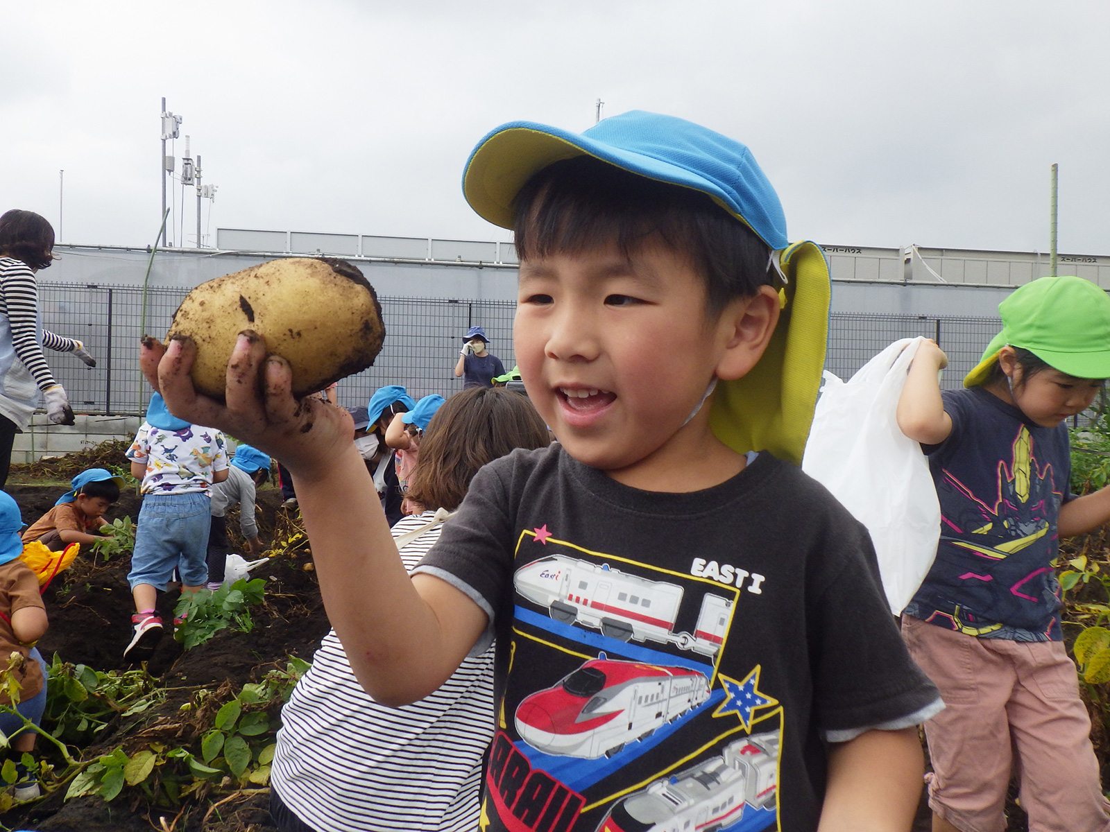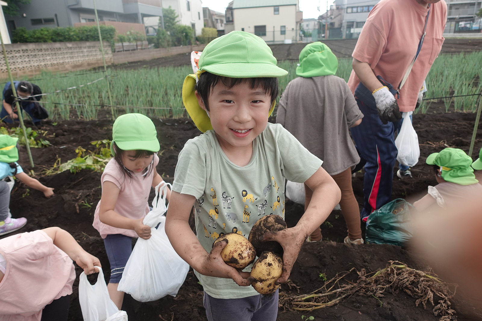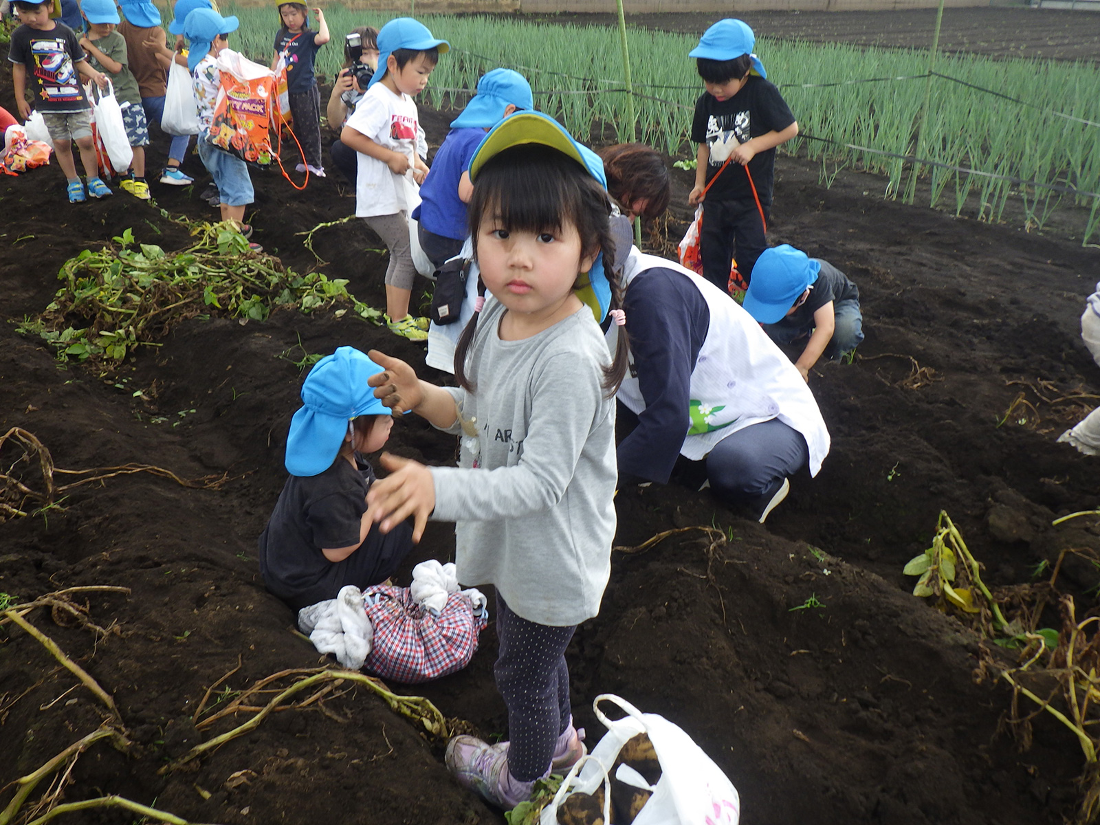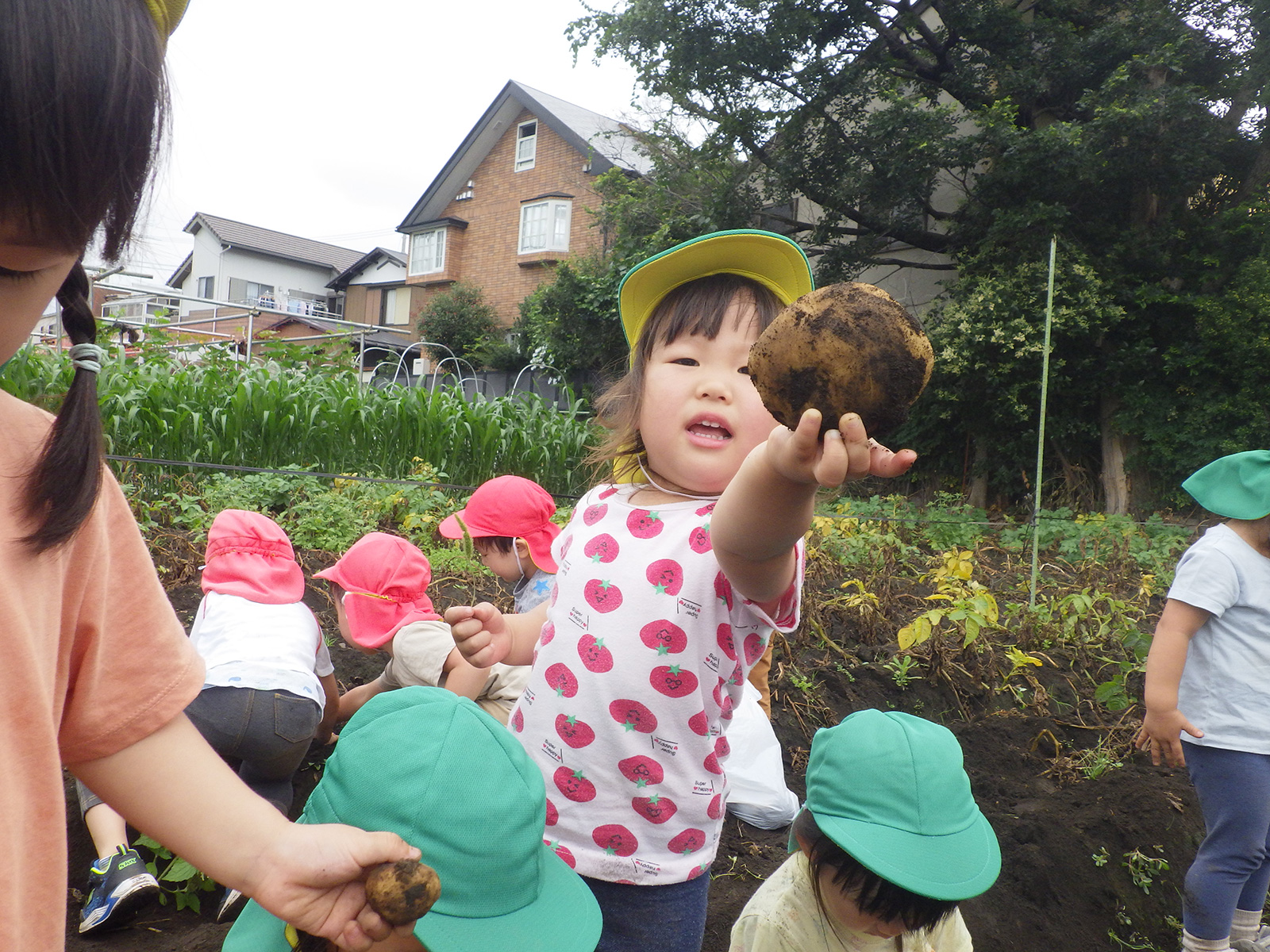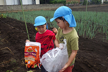 今年も豊作で、大きなじゃがいもを手にして子どもたちは目を輝かせていました。畑の土に触れ、手や顔を真っ黒にさせながら夢中になっている姿が印象的でした。