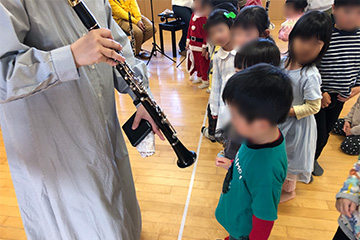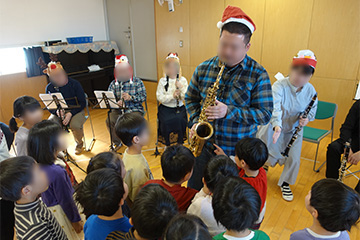ホールでクリスマスコンサートを楽しみました。今年は職員が所属する楽団の演奏です。トトロやアンパンマン、クリスマスメドレーと馴染みのある選曲で盛り上がりました☆途中でクイズがあったり、近くで楽器を見せてもらったりしましたよ。