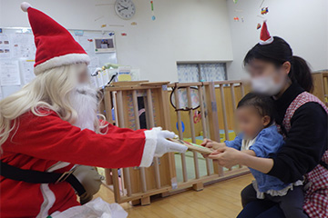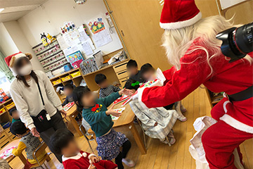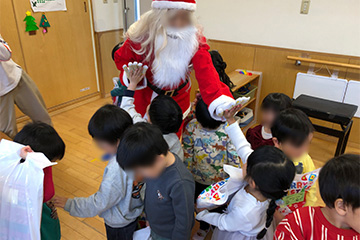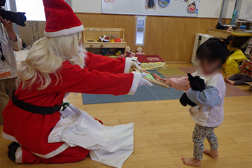 各クラスにはサンタさんが登場!一人ずつプレゼントを渡してもらいました。サンタさんにドキドキしながらも嬉しそうにしていた子どもたちです♪
