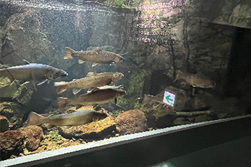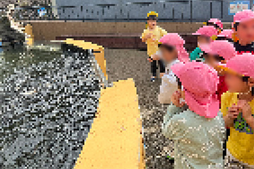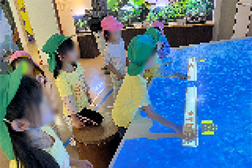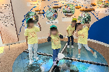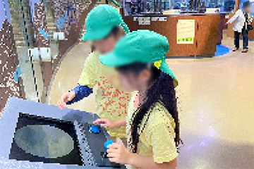 科学館内では大きな魚や可愛い魚に見入ったり、魚の生態が学べる展示に触れたりと自由に見学を楽しんでいましたよ。今日の目玉、お魚のえさやり体験では餌を近づけるだけで集まってくる大量の魚たちに「キャー!!」と大盛り上がりでした(笑)