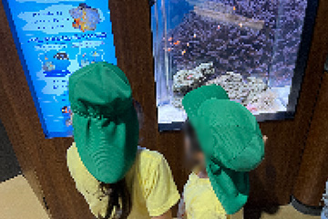 お魚たちに会うこと、みんなでお弁当を食べることなどなど楽しみがいっぱいで朝からウキウキの子ども達。少し長い道のりでしたが、クイズ大会やカラオケをしている間に到着しました♪
