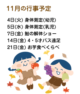 秋をゆっくりと感じる間もなく晩秋になってしまった今日この頃です。朝夕寒さが増し衣類の調節が難しいですが、天気の良い日中は基礎体温の高い子どもは半袖でも過ごせる暖かさの日もあり、外で遊んだり散歩に出かけたりするのにちょうどいい気候です。またサツマイモ・柿・栗等秋の味覚も真っ盛りです。10月下旬浮間の水再生センターに呼んでいただき、年長さんがお芋ほりをしてきました。自分の掘ったお芋はスーパー袋に入れて自分達で持ち帰ってくる予定でしたが、思いのほか大きなお芋に園にSOSの電話があり、職員が散歩カーを持ってヘルプに出かけるほどでした。そのお芋は1本を年長さんがお家へ持ち帰り、残りは園のベランダで甘さが増していくのを待っている所です。さて春に園の畑に植えたお芋は現在どのようになっているのでしょうか?これも収穫が楽しみです。11月21日には食育の一環でお芋の食べ比べをします。さつま芋・ジャガイモ・里芋をホットプレートで焼いて食べ比べてみます。また、今年はコロナから中断していた“鮭の解体ショー”を復活させ、子ども達に大きな鮭が切り身になっていく様子を見てもらい魚には骨や内臓がある事やスーパーに出ている切り身の元はこんな姿をしてるんだ等を知っていってもらえたらと思います。さばいた鮭は“ちゃんちゃん焼き”で美味しく食べる予定です。味覚だけでは無く、木々の紅葉も始まり味覚・嗅覚・視覚など五感をフル稼働できる季節です。たくさんお散歩にも出かけ子ども達に様々な秋を感じて行って欲しいと思っています。