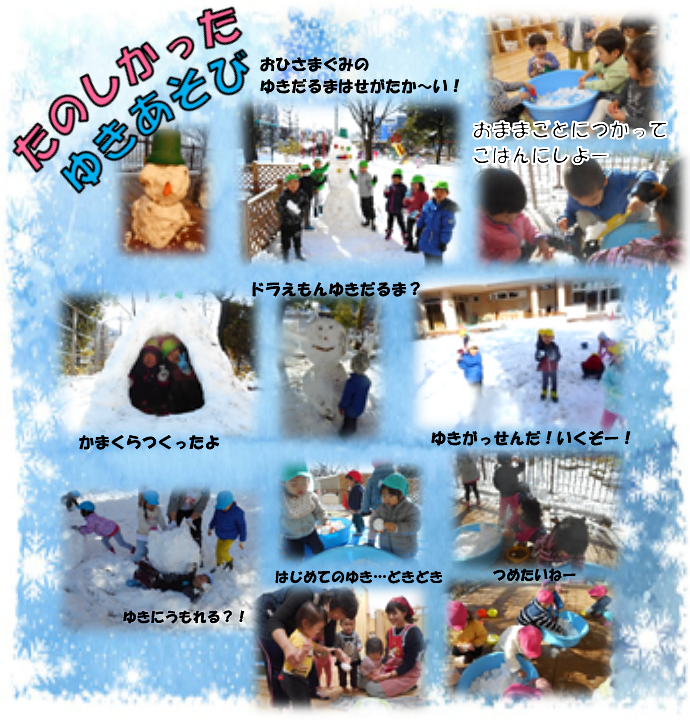 思いがけず降った雪!予想以上の雪に驚き、大喜びの子どもたち。上着を着て、手袋をつけ、長ぐつを履いていざ園庭へ…。小さな玉から大きな玉、そして大玉になり最後は各クラス雪だるまを創る体験をした幼児組。雪だるまの顔はクラスのカラーが出ていて思わず「クスッ」と笑ってしまいました。おひさま組は“かまくら”まで創り驚かされました。乳児組はたらいに雪を入れテラスに運び遊びました。雪は降ると後が大変!!でも、子どもたちにとっては自然がくれた大切な今だけの遊びとなっていました。今月も降るかなーと、わかばっこたちは目を輝かせ期待している気持ちが汲み取れます。