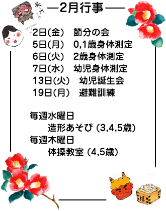 一年中で一番寒いと言われる2月。自分の中にある鬼を「おにはそと、ふくはうち」と追い払い暖かくなる春を待ちたいと思います。