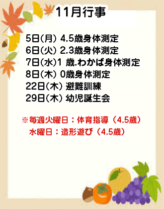 「おはよーございます。ほらみてみて!」と元気良く玄関に入って来る子ども達の手には、ねこじゃらしやどんぐりが握られ秋の訪れを運んでくれます。園庭の鬼ぐるみの木からは実が次々と落ち、数をかぞえたり、並べたり、ままごと遊びに利用したりと大変貴重な遊び道具のひとつとなっています。もうすぐ夏みかんやキュウイも収穫時を迎え、「ジュースにしたい」「ジャム作りたい」と子ども達からの声が聞かれ食育に繋がっていくことと思います。