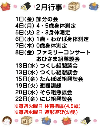 寒さが一段と増すこの時期、冬ならではの遊びや楽しみを思い存分味わいながら、今月も元気に過ごしたいと思います。各クラスの懇談会も開催されます。お忙しいことと思いますが宜しくお願い致します。