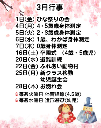春を待ちわびていたかのように、戸外遊びやお散歩をいつも以上に楽しんでいる子どもたち。「みんなでいってきまーす」「かえるいけいくの」「おはなみるの」「公園行くんだー」「雲夏(夏の雲)まで行ってきまーす」と出発! そして帰園すると「お花あったの においしたの うめのはな」「カモがスイスイおよいでたの」「いっぱいあるいたんだ」と矢継ぎ早の嬉しい報告が続きます。一人ひとりのそんな姿を見ているとこの一年間の成長の素晴らしさに胸が熱くなります。さて今月は、ひとつ大きなクラスでの保育が始まります。何かとご不便をおかけしますが宜しくお願い致します。