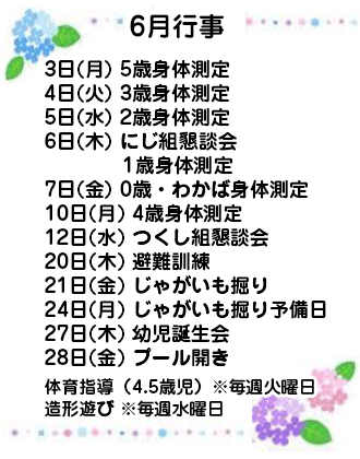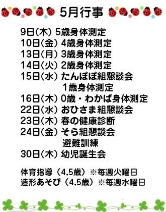 新年度がスタートしてあっという間に1ヶ月が経ちました。連休明けの保育園は、子どもたちのお土産話でにぎわっています。そんなお話を一部紹介します。その①「おじいちゃん・おばあちゃんにあったの」その②「ずーとひかりがおかこうえんにいった」その③「10こやすみでしんぱいだった」(クラスで飼い始めたてんとう虫・だんごむしのこと)その④「あかちゃん、うまれた」とわかばっこ達のはなしは次々ととびだしていました。今月は休みが続き少し疲れが出る頃かと思いますが、体調に気をつけながら大好きな散歩に出かけ、爽やかな季節を満喫したいとおもいます。