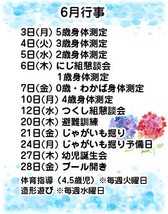 門をあけると、沢山のマーガレットの花が出迎えてくれていましたが、その盛りも終わりあちこちであじさいの花が少しずつ色づきはじめ、梅雨の気配を感じる時期となりました。少しの雨ならしのぐことのできる屋根付きウッドデッキの場所があり、そこにコンテナを運び先日は「地下1階のおうちだよ」「せんせいもはいっていいよ」と招待を受けました。小さいコンテナが玄関ドアになり「どうぞ、がらがらがら」とドアが開き中に入ると「ぱちん」と閉まりました。そこは子ども達の想像が広がる素敵な世界。ひとしきり遊び「おじゃましました」と頭を下げドアを開け出ると「またきていいよ」と、嬉しい言葉があり私はニヤニヤ顔で事務所に戻りました。梅雨はうっとうしいと思わず、自然に触れたり室内ならではの遊びを楽しみながら、異年齢交流の良い機会と捉え元気に過ごしたいと思います。
