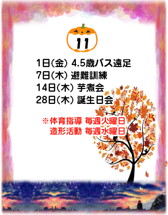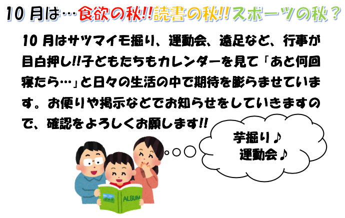さわやかな秋風にのって、キンモクセイの甘い香りが感じられるこの頃・・・。日々過ごし易くなってきたこともあり、毎日良く食べよく動き、遊びを楽しんでいるわかばっこたちです。