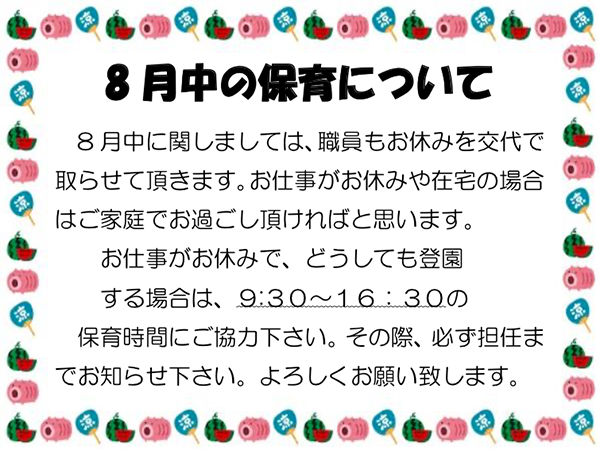 先月の終わり頃から園庭でセミが鳴き始めました。長い梅雨空に少し気持ちがめいっていましたが、元気に鳴くセミの声に本格的な夏の到来を肌で感じわくわくしました。わかばっこたちは、セミの声を聞くとすぐ「園長先生あみくださ~い」と事務所に飛び込んできます。あみを持って大きな木をめがけて走っていく子どもの姿に、心がほっとし我園の自然の多いことに感謝、感謝・・・でした。そして゛コロナウィルスに負けてたまるか゛との思いでいっぱいになりました。これからは、暑い、暑い毎日になりますが、たくさん遊んでもりもり食べてしっかりと休息をとりながら今月もおもいきり楽しみたいと思います。ひき続き在宅勤務される保護者の方には、ご協力いただくこと多々あることと思いますがこれからもよろしくお願い致します。