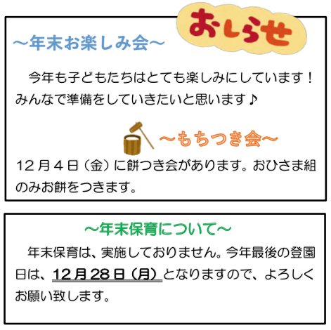 園庭の木々から舞い散る枯れ葉が、本格的な冬の訪れを感じさせてくれるこの頃。先月より少しずつ散歩に行き始めたわかばっこ達!「いってきまーす」と元気に出発するひとりひとりの背中がとても逞しく感じられます。かえる池・春の風公園・夏の雲公園と行き慣れていた場所も、とても新鮮さがあるようで「ただいまー」と帰園すると「あかいはっぱあったの、きいろも」「むし、さがしたよ」「いっぱい、はしったー」と次々とおみやげ話で玄関は一時とても賑やかになります。そして、つぼみ・つくし組は今、三輪車が大好き・・二人乗り三輪車も大人気!小さい暴走族が園庭を走り回る元気な姿に思わず笑みが浮かびます。今年も瞬く間に過ぎていき、あっという間に最後の月となりました。コロナ禍での今年1年、ご協力ありがとうございました。どうぞ良いお年をお迎えください。