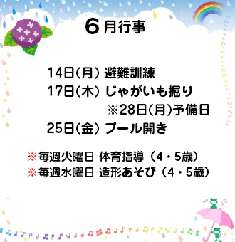あっという間に春が過ぎ去り季節は梅雨の時期がやってきました。今月は自然に触れたり、室内ならではの遊びを楽しみながら過ごしていきたいと思います。