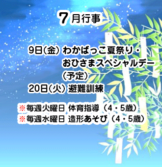☆おひさま組は夕方のスペシャルデーもありますので、詳細はクラスでお知らせ致します。