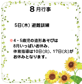 夏季保育アンケートのご協力ありがとうございます。夏季に関しましては職員も交代でお休みを取らせて頂きます。特に8月はお仕事がお休みや在宅でご協力頂ける場合は、ご家庭でお過ごし頂ければと思います。よろしくお願い致します。