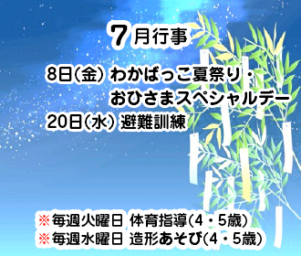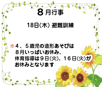 夏季に関しましては、職員も交代でお休みを取らせて頂きます。特に8月はお仕事がお休みや在宅でご協力頂ける場合には、ご家庭でお過ごし頂ければと思います。よろしくお願い致します。なお、予定に変更があった場合は、お手数ですが担任までお知らせください。