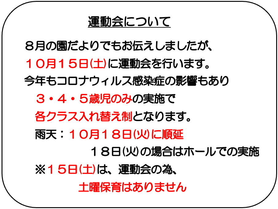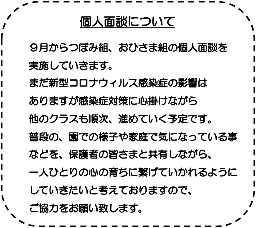 8月は、新型コロナウイルス感染症の影響で保護者の皆さまにも、大変ご心配おかけしました。また、お休みのご協力ありがとうございました。まだまだ続くコロナ禍ではありますが、子どもたちの笑顔を絶やさないためにも、園として出来る限りの生活様式を取り入れ、今後も職員一丸となって努力していきたいと思います。