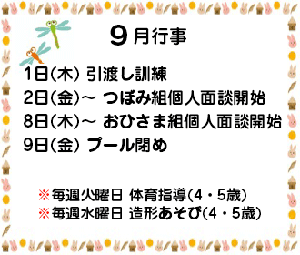 コロナの影響はありましたが、夏休みを家族そろってゆっくりと家庭で過ごし、出かけた事など、久しぶりに登園してきたこどもたちは嬉しそうに保育者に話してくれました。