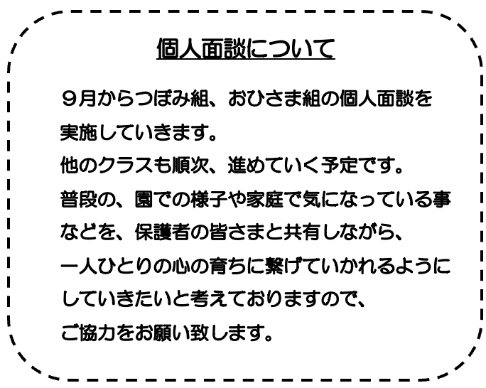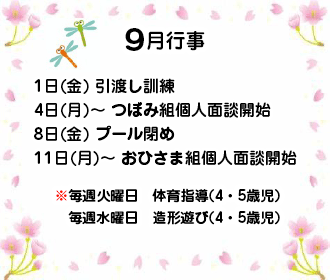 遠く澄んだ空に、朝夕の心地よい風、少しずつ秋の訪れを感じるようになりましたが、まだまだ暑さが残り外遊びやプールも、なかなか思うようにはできない事も多いです。