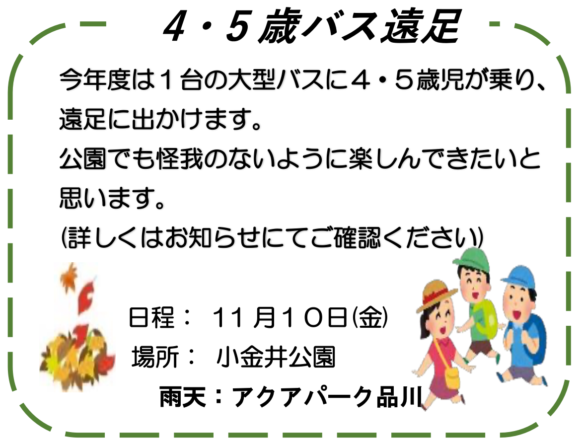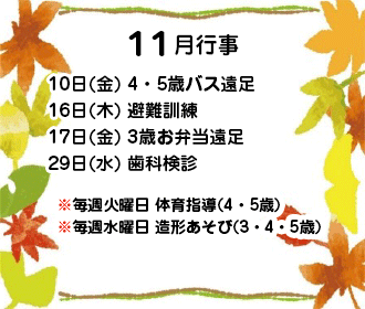 11月は4・5歳児がバス遠足・3歳児がお弁当を持って近隣の公園にお散歩に出かけます。乳児クラスも子どもたちの体調や体制を考慮しながら散歩に出かけ、秋の自然に触れ親しんでいきたいと考えています。