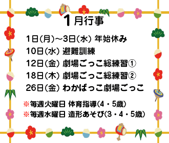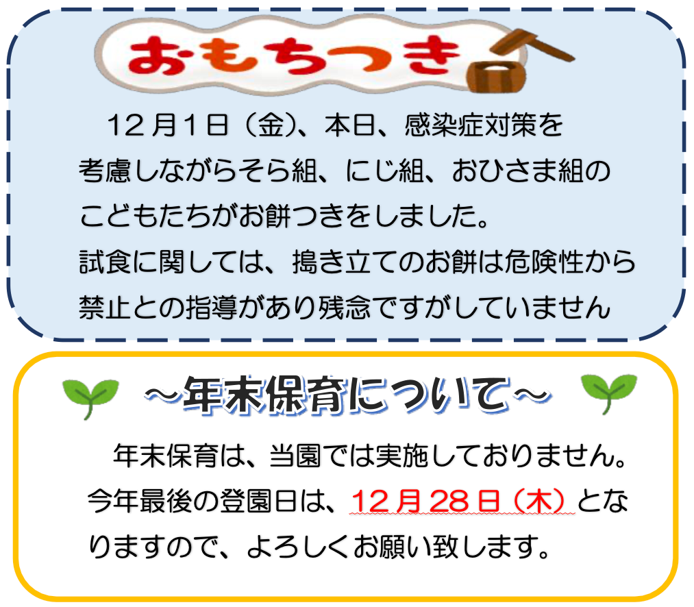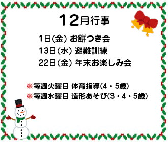 今年も瞬く間に過ぎ、あっという間に最後の月となりました。保護者の皆さまにも、いろいろとご協力頂き、ありがとうございました。年末年始、ご家族揃って元気に良いお年をお迎えください。