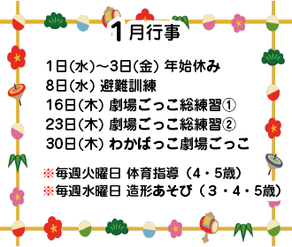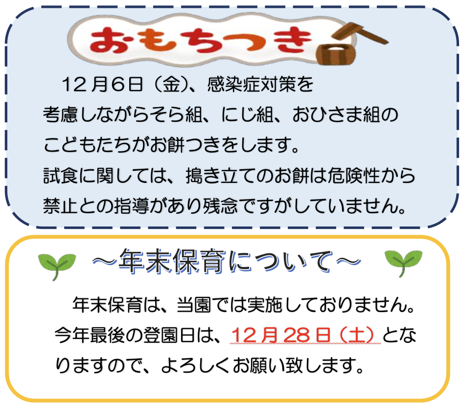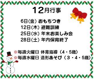 今年も瞬く間に過ぎ、あっという間に最後の月となりました。保護者の皆さまにも、いろいろとご協力頂き、ありがとうございました。年末年始、ご家族揃って元気に良いお年をお迎えください。