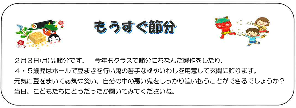 ♪ 鬼はそと 福はうち パラッパラッパラッパラ 豆の音 鬼はこっそり逃げていく ♪
