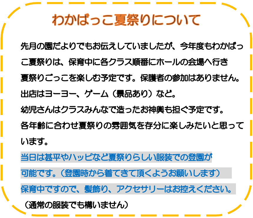 今年はあっという間に梅雨開けとなりそうです。天気が良く暑い日もますます増えそうですが、わかばっこ達は元気いっぱい。汗をかきながら、夢中になって遊びを楽しみ、たくさん遊んだ後は、麦茶をごくごく飲みほし『おかわりー』の声があちらこちらから聞こえています。