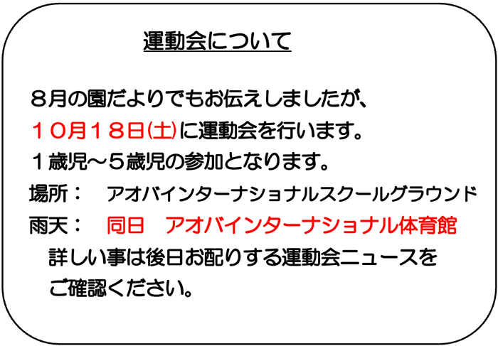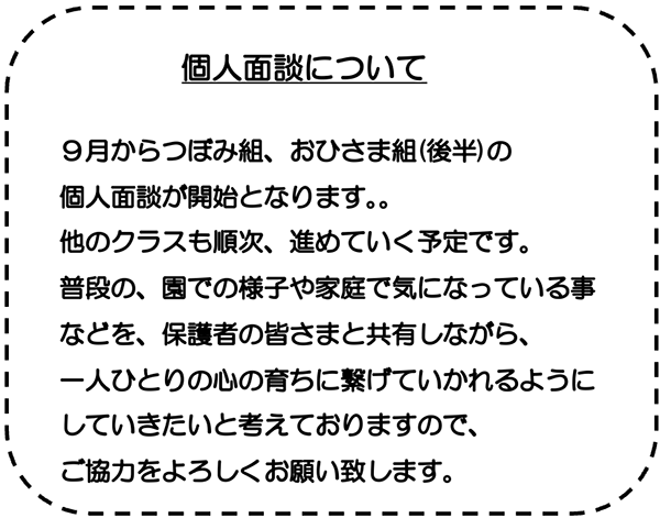 夏休みは家族そろってゆっくりと家庭で過ごし、おじいちゃんおばあちゃんに会ったり、旅行に行ったりとお出かけした事を、久しぶりに登園してきたこどもたちは嬉しそうに保育者にも話してくれました。